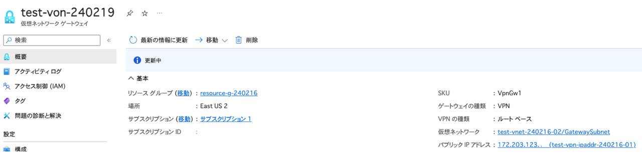 仮想ネットワークゲートウェイは以下のように作成しました。
