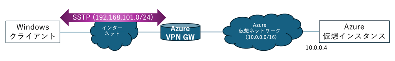 事前準備として、Azure仮想インスタンス1つ、そのインスタンスが接続する仮想ネットワークを作成し、そこに仮想ネットワークゲートウェイ(VPN GW)を構築します。