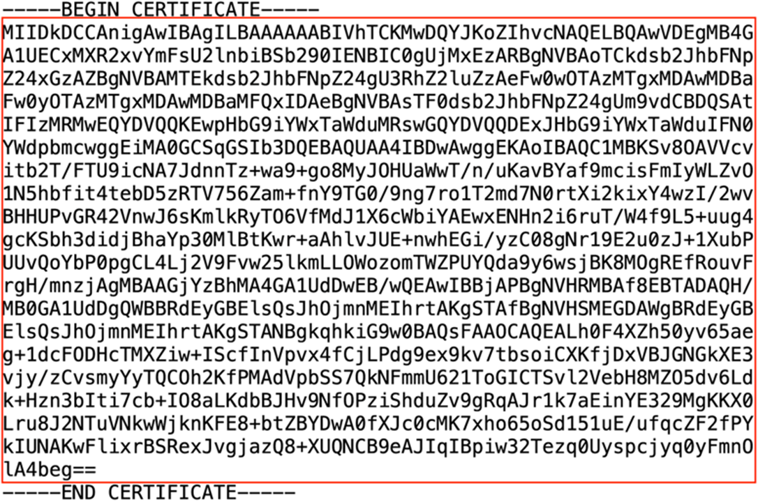 ダウンロードしたファイルをテキストエディタで開き、最初の行と最後の行("-----BEGIN CERTIFICATE-----"と"-----END CERTIFICATE-----")を除いたものが対象データになります。