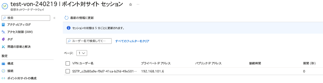 Azure Portalの「ポイント対サイト セッション」でVPN接続ユーザを確認できます。