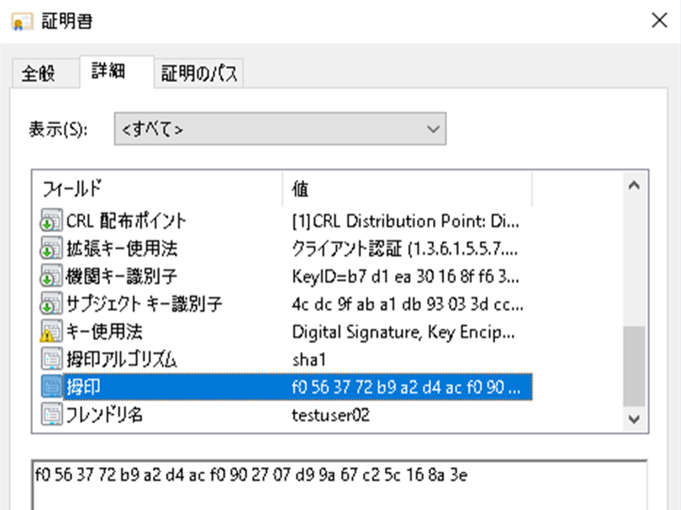 拇印は証明書データから取得することができます。Windowsでみるとスペースで区切られますが、Azure Portalに入力する際にはスペースは省きます。