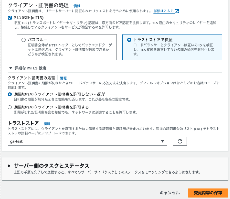 相互認証(mTLS)にチェックをして、「トラストストアで検証」を選択し、トラストストアには上記で作成したトラストストアを指定するという流れです。