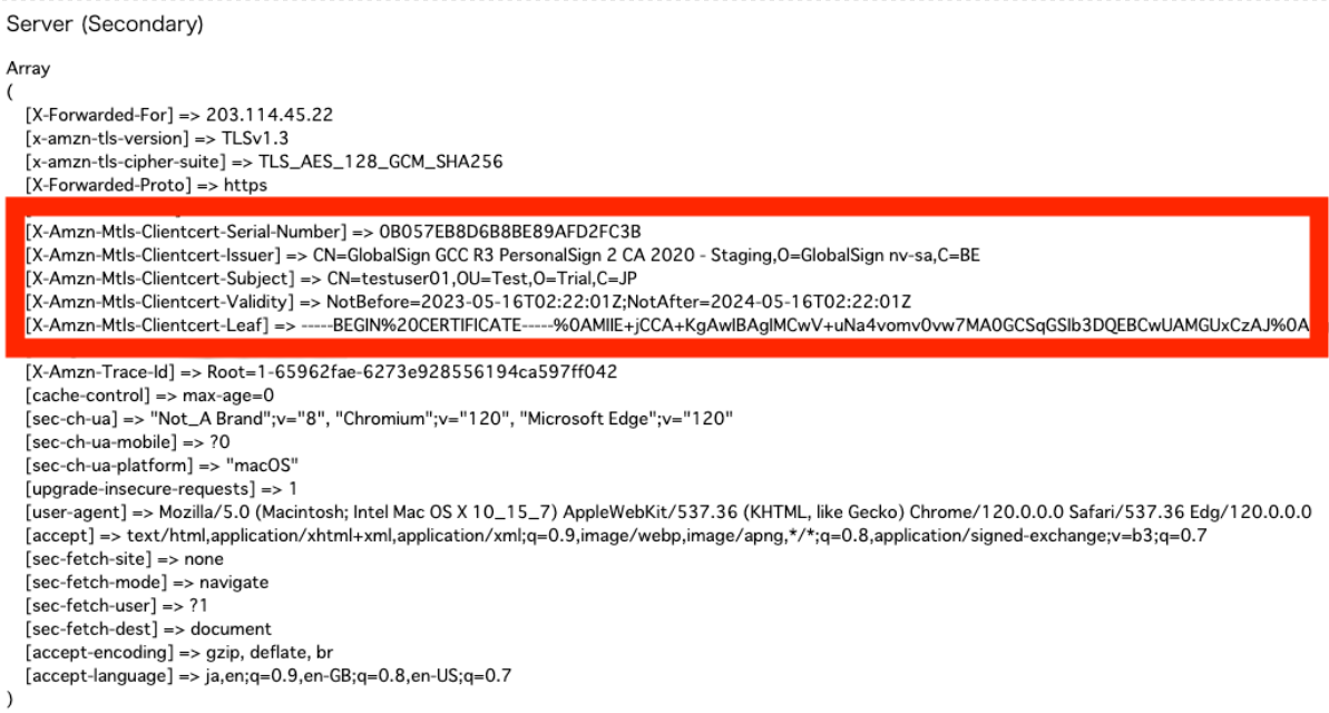 これにより、ALBが付加するhttpヘッダーにより証明書情報がWebサーバに伝搬されていることがわかります。