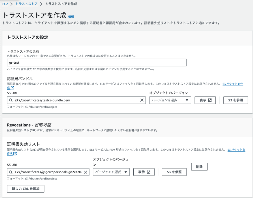 認証局バンドルにはS3にアップロードしたCAチェーンのファイルを設定し、証明書失効リストにはCRLファイルを指定してトラストストアを作成しておきます。