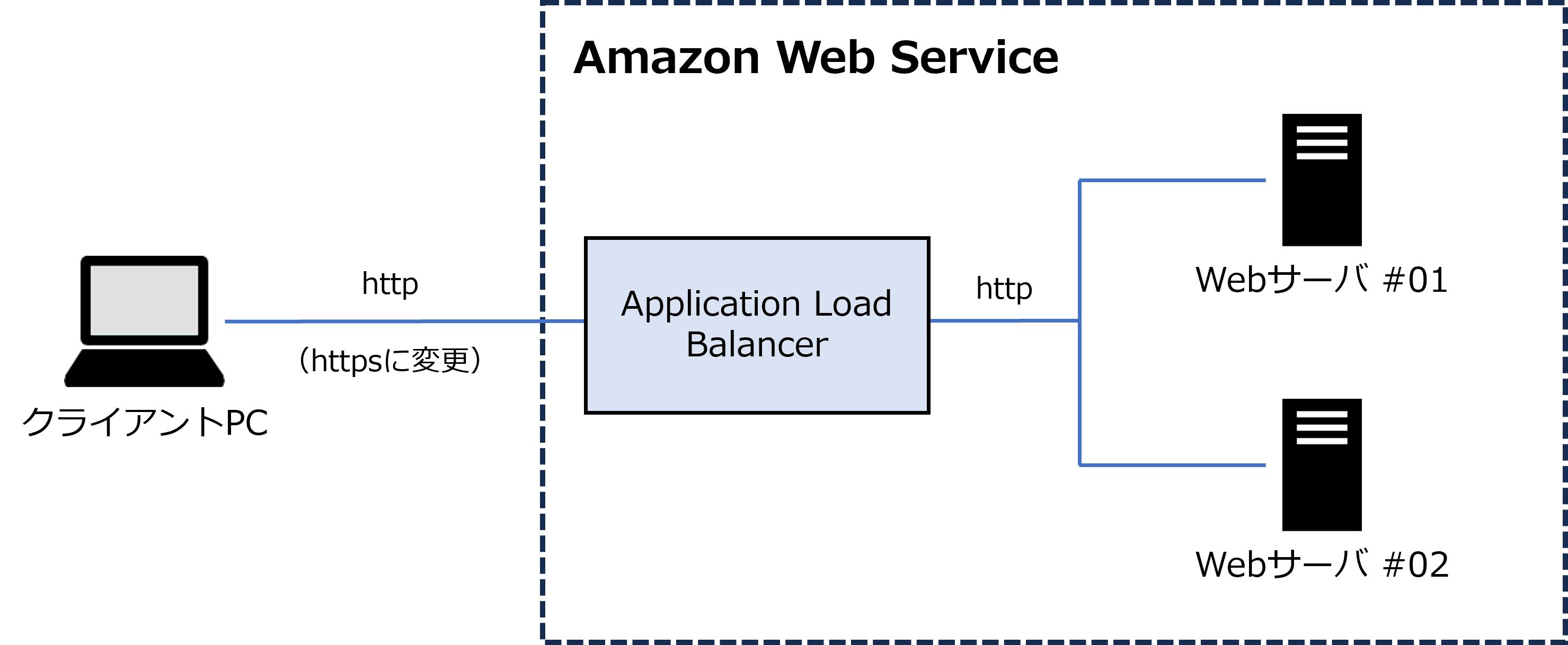 この時点では、クライアントPCとALBはhttpで通信を行っている状態とします。
