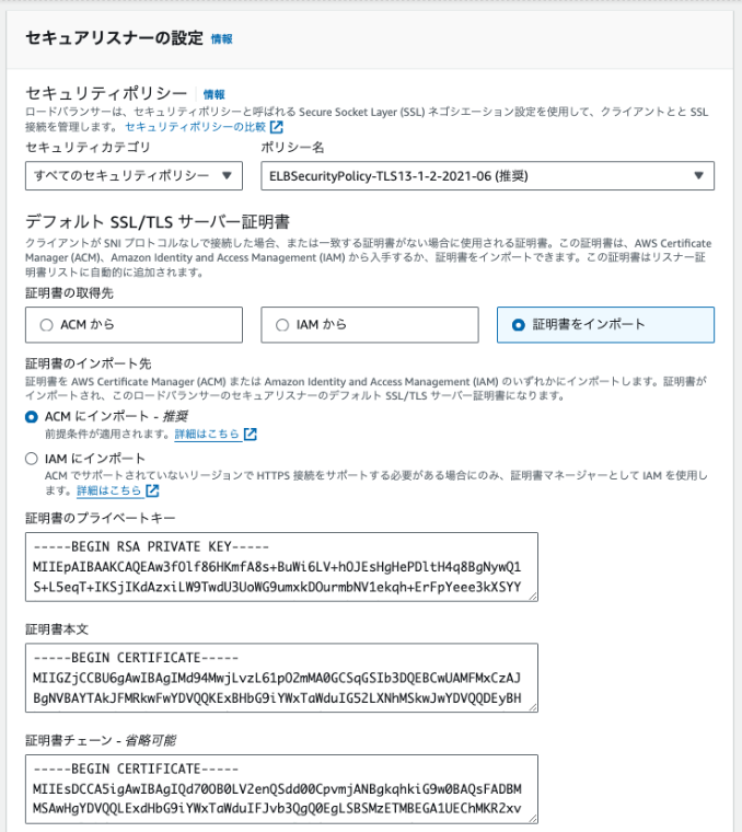 「証明書をインポート」を選択し、秘密鍵ファイルや証明書ファイルをテキストエディタで開き、その内容をコピーし、貼り付けます。