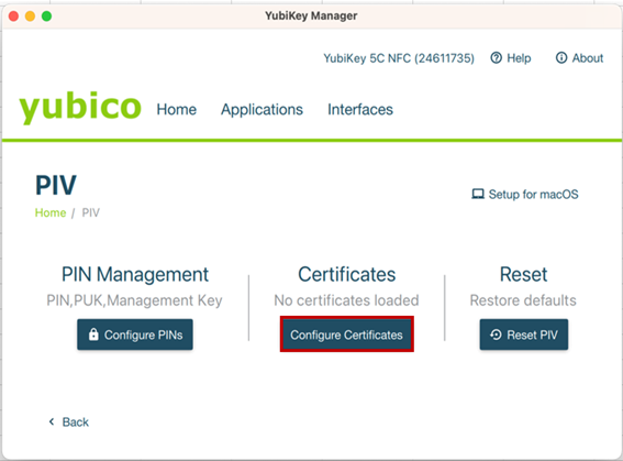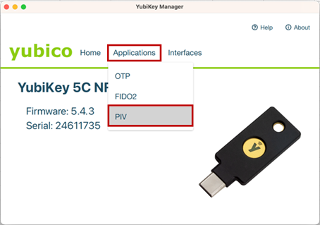 ① 「YubiKey Manager」を起動し、「Application」から「PIV」をクリックします。