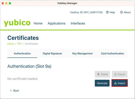① 「YubiKey Manager」で「Import」をクリックし、保存した証明書ファイルを選択します。