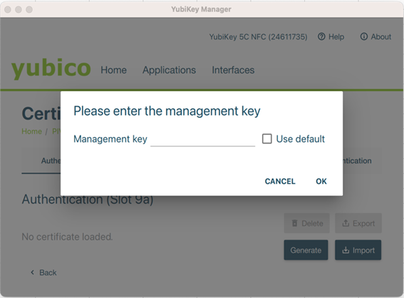⑧ 表示されるポップアップへ「Management Key」と「PIN」を入力します。