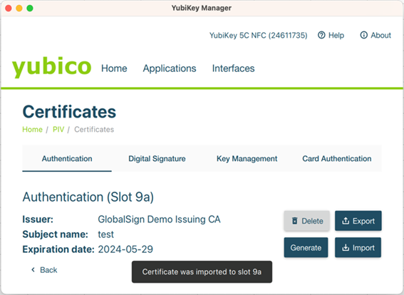 ③ YubiKeyへの証明書のインポートが完了します。
