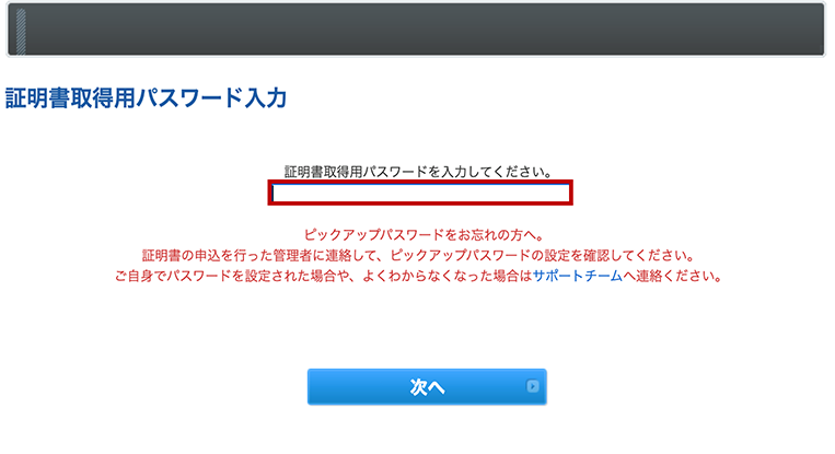 ① 証明書取得のメールを受信後、記載されたURLにアクセスし、管理者が指定し通知された「証明書取得用パスワード」を入力します。