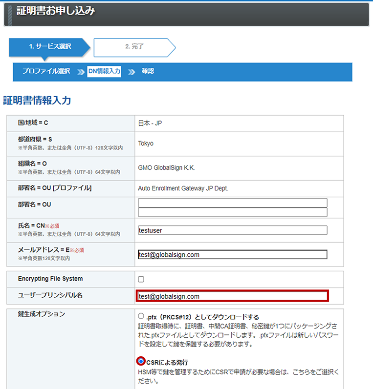 以下の点に注意してGSパネルにて証明書申請を行います。