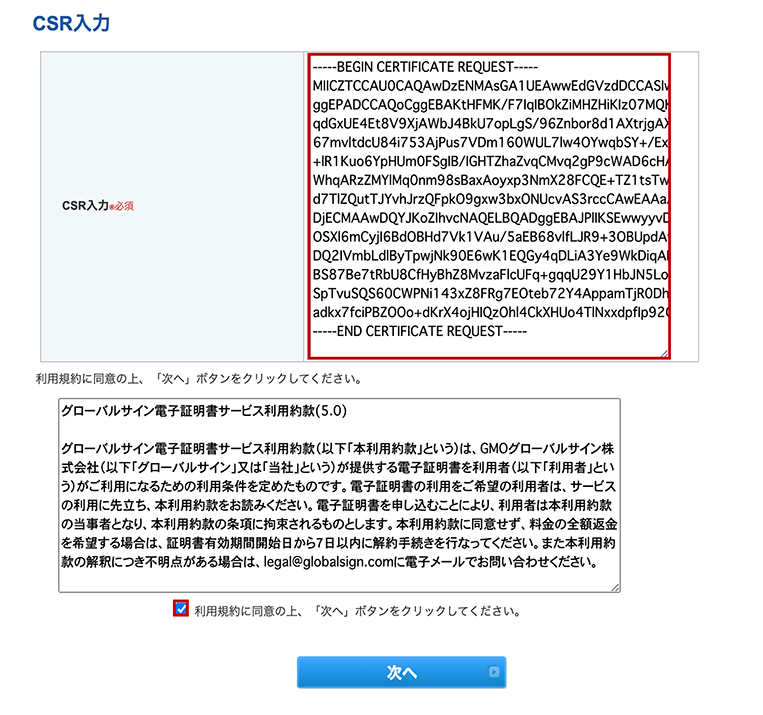 ② YubiKeyで作成したCSRをメモ帳などのテキストエディタで開き、そのテキストデータを「CSR入力」の項目にコピー&ペーストします。 利用規約の確認後、チェックを入れて「次へ」をクリックします。