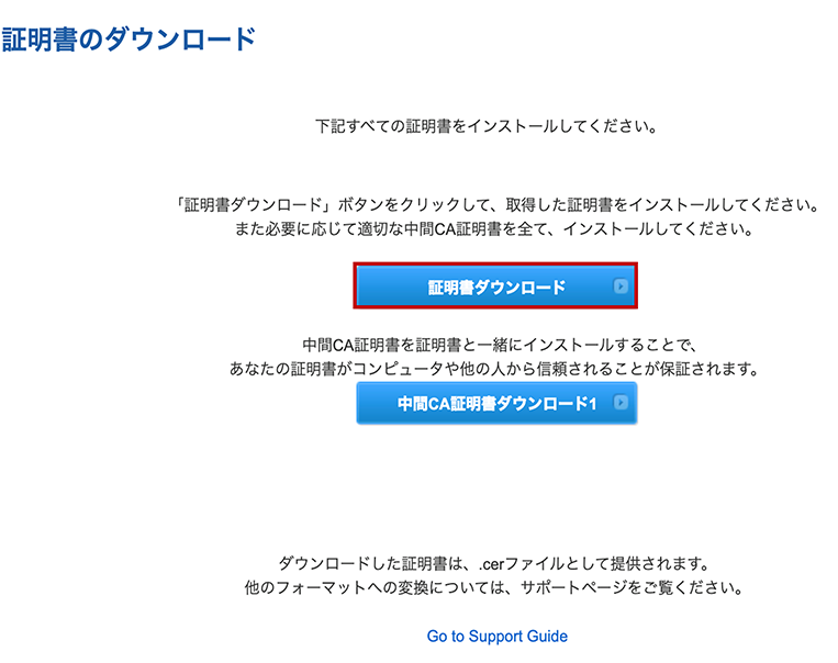 ③ 「証明書ダウンロード」をクリックして、証明書ファイルをダウンロードします。 [MPSxxxxxxxxxxxxxx.cer]というファイルがダウンロードされますので、この拡張子を.cerから.crtに変更します。
