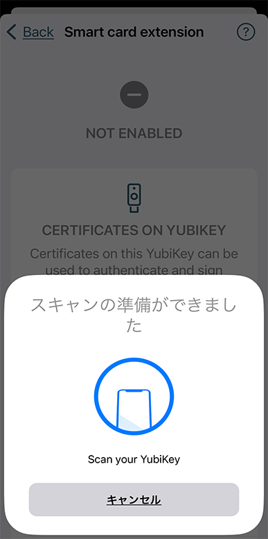 ④ 画面を下方向にプルダウンすると、スキャンしようとします。 YubiKey をiPhoneにかざします(NFC通信を行います)。