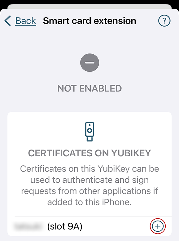 ⑥ YubiKeyの中にある証明書が表示されるので、⊕ボタンをタップします。