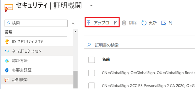「Azure Active Directory」>「セキュリティ」>「証明機関」>「アップロード」に進みます。