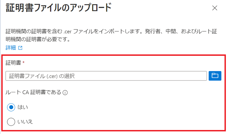 ② アップロードする証明書を選択します。ルート証明書と中間CA証明書をそれぞれアップロードする必要があるため、この手順は2回実施します。 ルート証明書をアップロードする場合、「ルートCA証明書である」で「はい」を選択します。中間CA証明書をアップロードする場合は「いいえ」を選択します。