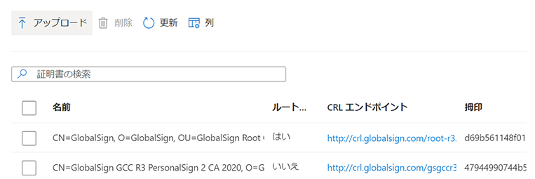 ④ ルート証明書と中間CA証明書が正常にアップロードされると、アップロード済みの認証局証明書の一覧が表示されます。