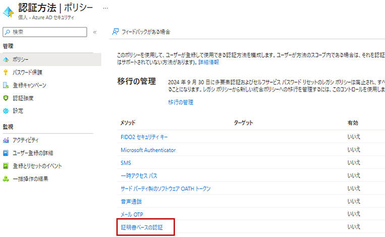「Azure Active Directory」>「セキュリティ」>「認証方法」>「証明書ベースの認証」に進みます。
