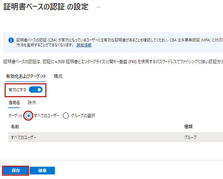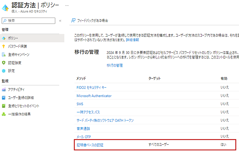 ⑤ Azure AD CBAの認証を有効化します。