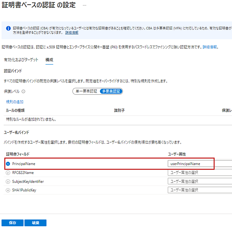 ⑦ 「構成」画面にて、認証設定を行います。 証明書認証をすることで多要素認証となるように設定し、ユーザー名バインドの証明書フィールドではuserPrincipalNameを設定します。 この設定により、ユーザーから提示されるクライアント証明書のサブジェクト代替名ユーザプリンシパル名フィールドが、ログインユーザーのuserPrincipalNameと一致しているか、認証時にチェックされるようになります。