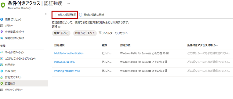 「Azure Active Directory」>「セキュリティ」>「条件付きアクセス」>「認証強度」に進みます。「+新しい認証強度」をクリックします。