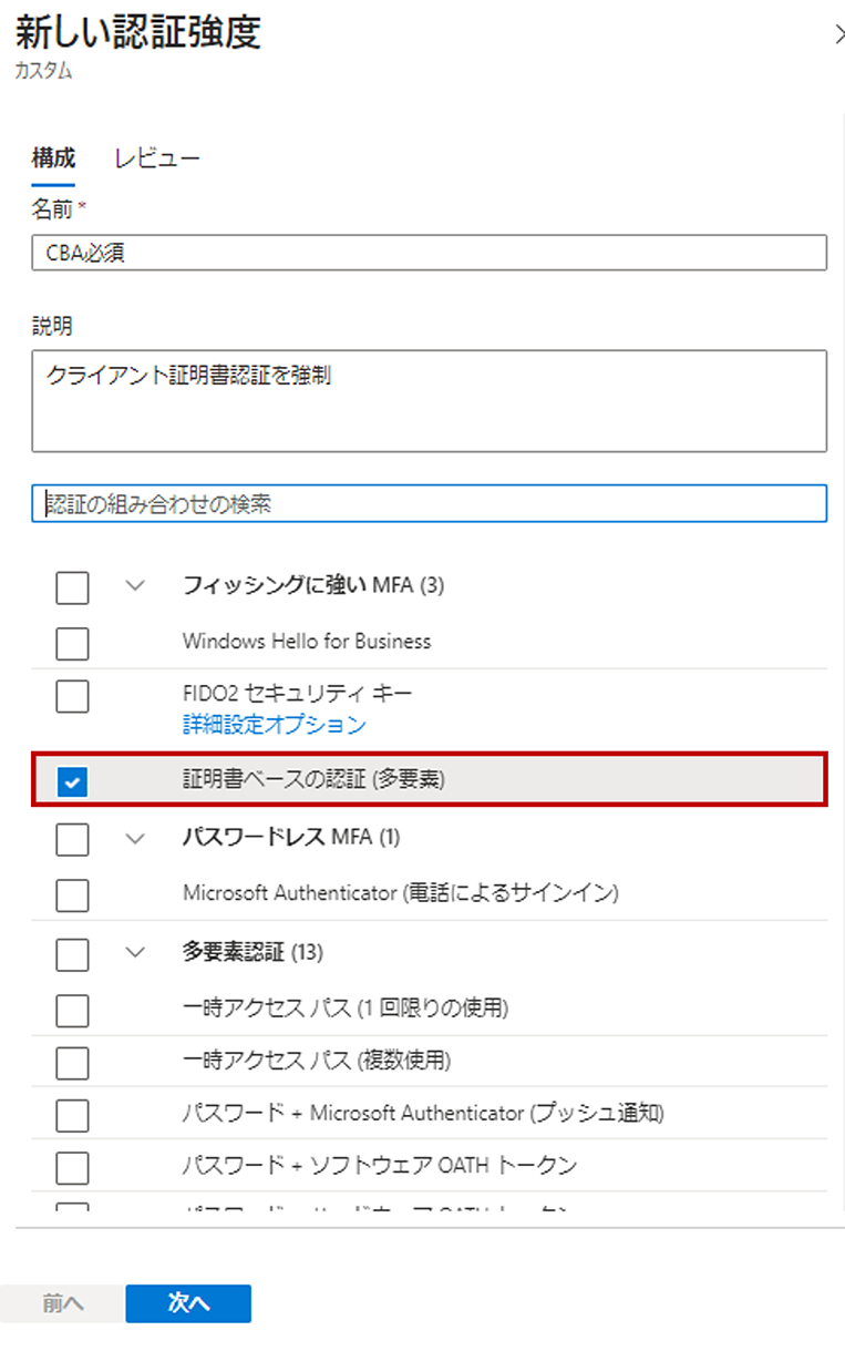 ⑩ 認証強度を定義します。「証明書ベースの認証(多要素)」にチェックを入れます。