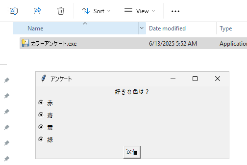 ② 実行ファイルをクリックすると好きな色を聞いてくる実行ファイル【カラーアンケート.exe】を作成しました。
