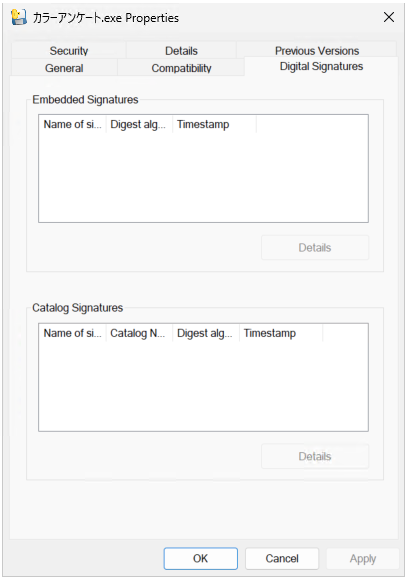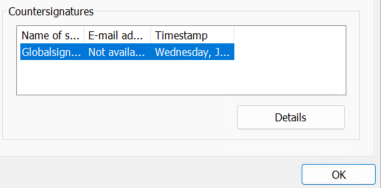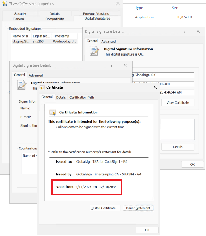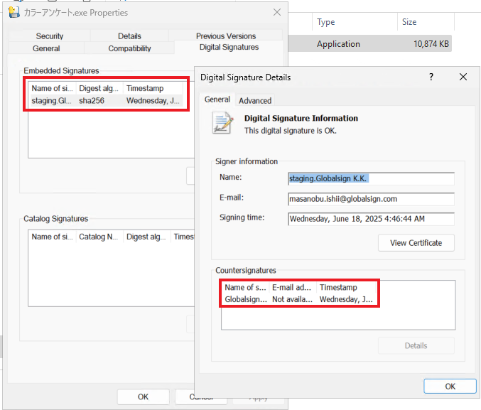 今回は署名時にタイムスタンプオプションも使用したため、Countersignatures(副署名)にタイムスタンプ証明書も付与されています。