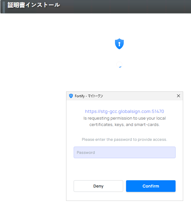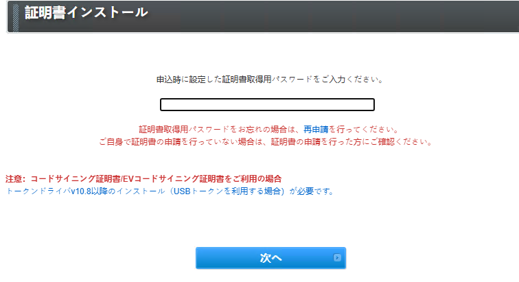 ⑭ 証明書取得用URLから取得作業を進めます。申請時に入力した証明書取得用PWを入力します。