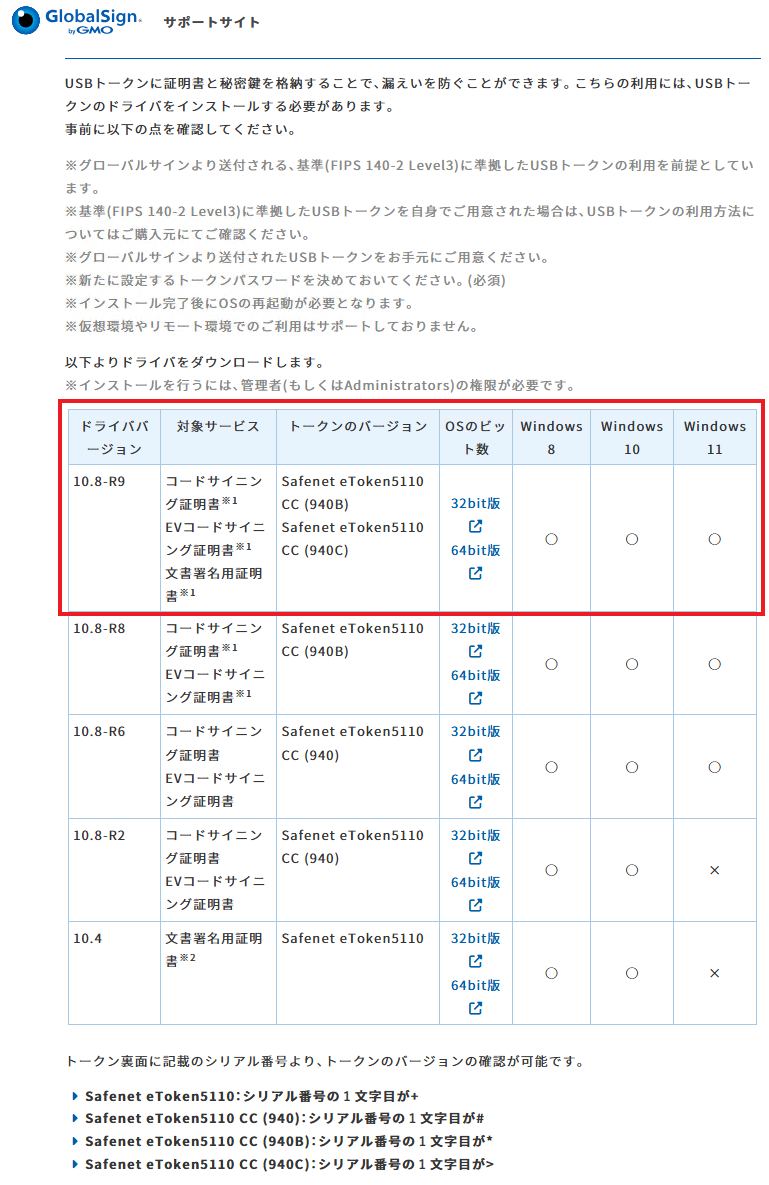 ポイント:ドライバはUSBトークンや、Windowsとの最適な組み合わせがあるため、適宜verを合わせること