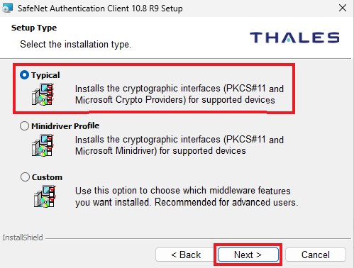 ⑧ USBトークンを端末に識別させるため、ドライバをインストールします。弊社サポートページ『Windows用USBトークンドライバのインストール方法』をご参照ください。