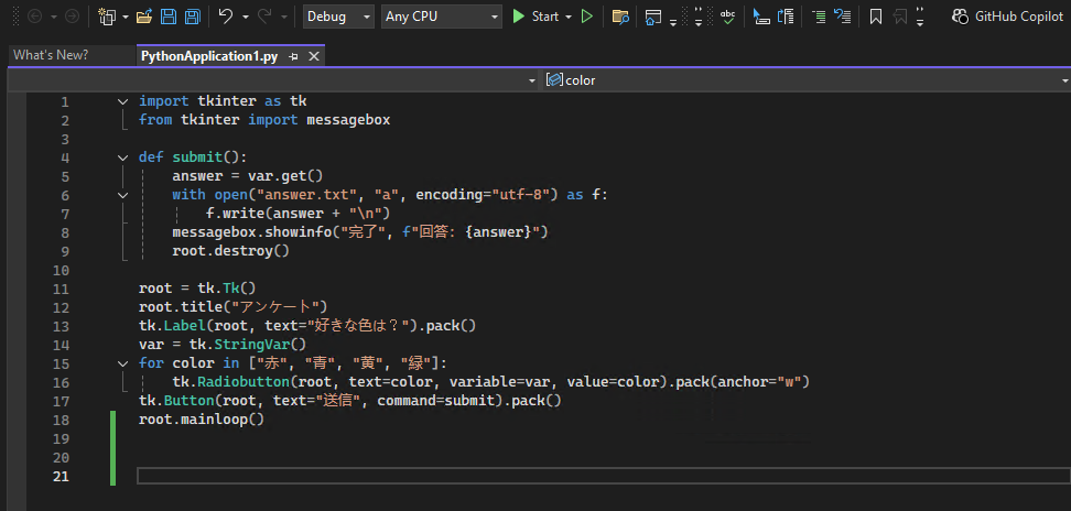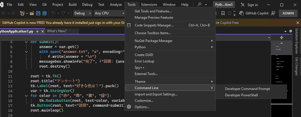① VSC上で署名を行うEXEファイルを作成します。今回はVisual StudioでPythonの簡単なアンケート実行ファイルを作成します。