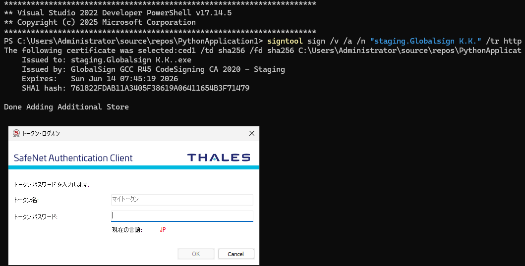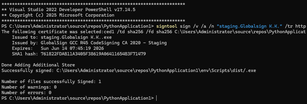 signtool sign /v /a /n "staging.Globalsign K.K." /tr http://timestamp.globalsign.com/tsa/r6advanced1 /td sha256 /fd sha256 C:\Users\Administrator\source\repos\PythonApplication1\env\Scripts\dist/カラーアンケート.exe