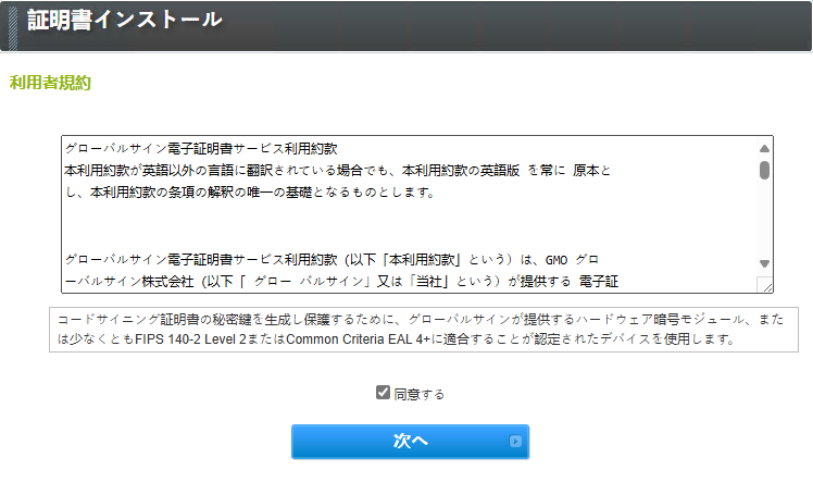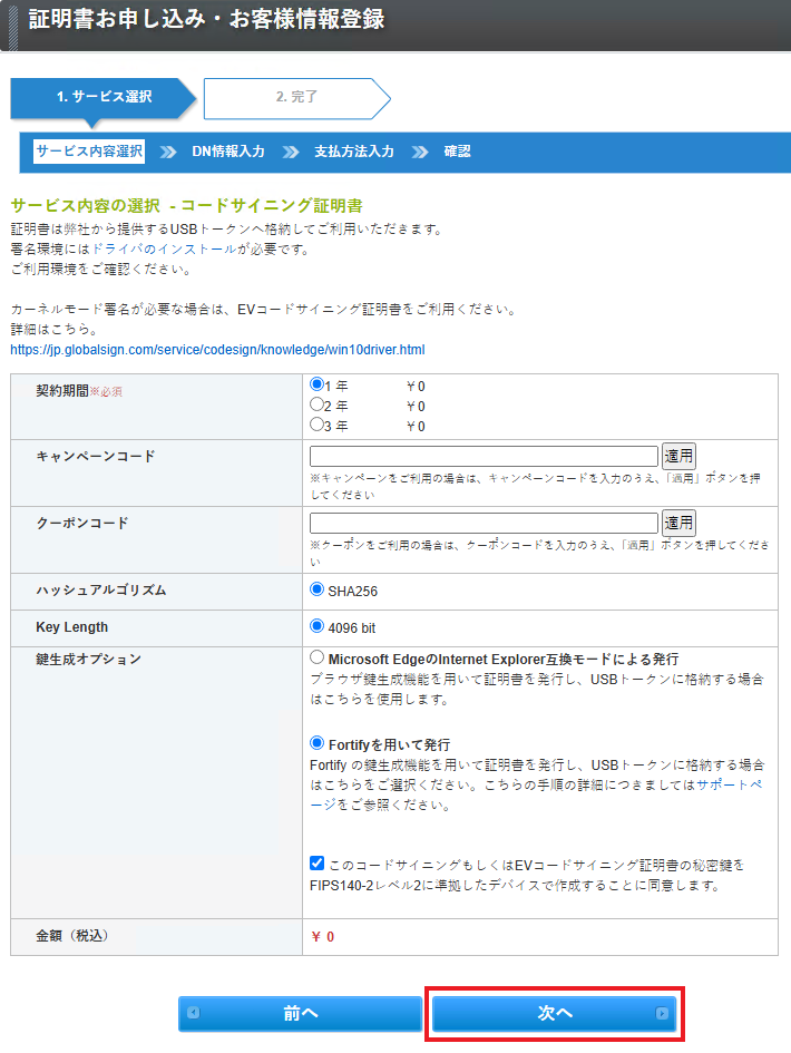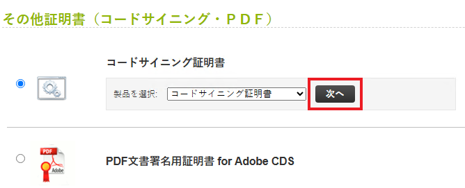 ② サービス選択からコードサイニング証明書を選択し、次へ進みます。