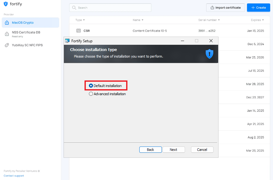 ⑯ Fortifyが起動し、証明書の内容確認画面が表示されます。問題がなければ「作成」を押してください。