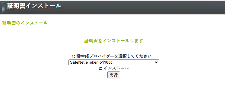 ⑲ 鍵生成が完了すると、以下の画面の表示となります。「実行」ボタンを押して証明書のインストールを行います。