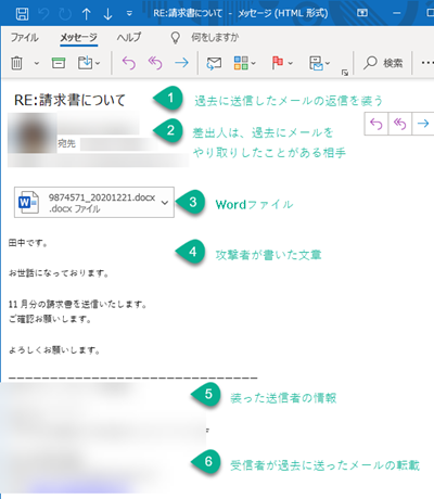 - 件名は、過去に取引先に送信したメールの返信を装っている