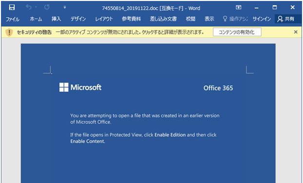 - 添付ファイルは、マクロ付きのMS Word、またはパスワード付きZipファイル(中にマクロ付きのMS Wordが圧縮されている)があり、Wordファイルを開き「コンテンツの有効化」ボタンをクリックすると、マルウェアに感染する(図2参照)