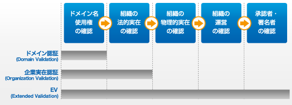 SSL/TLSサーバ証明書には「ドメイン認証」「企業実在認証」「Extended Validation(EV)」の3種類が存在します。ドメイン認証は最も手軽な反面、ドメインの使用権のみを認証する証明書しか発行できません。組織の実在認証をするためには「企業実在認証」、「EV」を導入する必要があります。また企業実在認証もドメインの使用権と組織の法的実在の認証は可能ですが、それ以上の「組織の物理的実在」「組織の運営」などのより高度な認証を行うにはEVの導入が必要です。