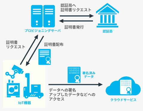 IoTにおける不正アクセス・ネットワーク上のデータの盗聴・データの改ざん対策として、電子証明書の導入を検討してみてはいかがでしょうか。
