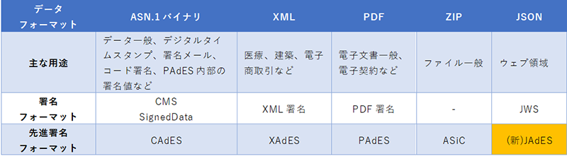 様々な署名フォーマットと比較した「JAdES」の特徴
