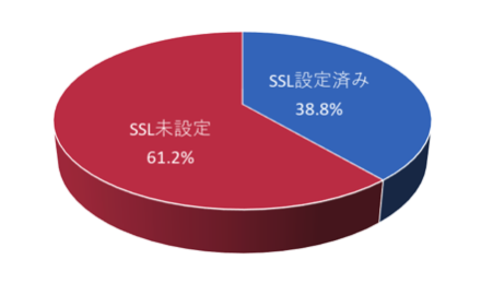 地方自治体のサイトでのSSLの設定は、どの程度なされているのでしょうか。2018年6月現在のSSLの設定状況は、以下のグラフの通りでした。 図1:自治体におけるSSLの利用状況 全国の地方自治体1,788サイトの内、SSLが設定されているサイトは全体の38.8%でした。