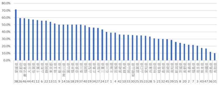 全ての地方自治体のSSLの設定率を記載するのは煩雑ですので、以下、地方自治体が存在する都道府県毎に分類し、都道府県と市区町村のSSLの設定率を単純平均し、比較しました。下のグラフは、都道府県(市区町村を含む)毎のSSLの設定率を示したものです。以下、都道府県名は、注釈がない限りは、当該都道府県下の市区町村を含む地方自治体全体を指すものとします。