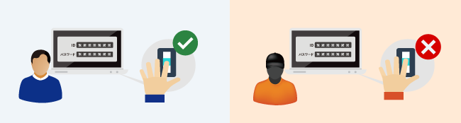 多要素認証は「ID」と「パスワード」に加え、「乱数表」や「ワンタイムパスワード」また「指紋認証」や「顔認証」など、いくつかの認証方法を組み合わせることで、なりすましのリスクを減らすことができます。
