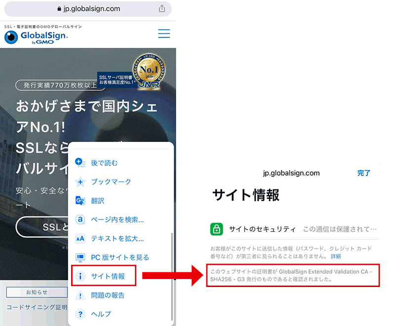 やむを得ずURLを確認しなければならない場合は、スマートフォンにてChromeのブラウザ右下にある「サイト情報」から、SSLサーバ証明書を確認することができます。