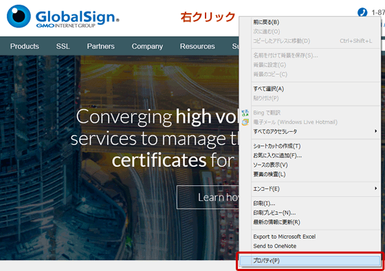 もしも鍵のアイコンが表示されていないときは、表示されたページ上にマウスポインタを重ね、右クリックをして「プロパティ」を表示、さらに「証明書」を表示することで、電子証明書の内容を確認することが可能です。