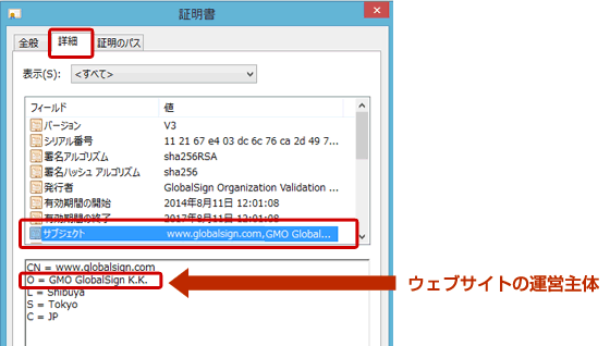 2. 「証明書」ダイアログの「詳細」タブをクリックすると、ウェブサイトの運営主体など様々な情報が表示される