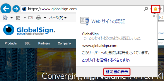 鍵のアイコンが表示されていれば、そのサイトがSSLを導入しており「確かにこの企業のウェブサイトである」旨の証明を受けていることが分かります。その鍵のアイコンをクリックすると、証明書の内容を表示することができます。